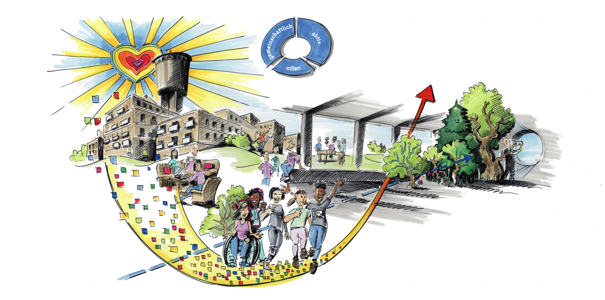 Um diese komplexen Fragen nicht mit standardisierten Phrasen zu beantworten, stand uns mit Dominik von Lösch ein Gedankenzeichner zur Seite. Er visualisierte über zwei Tage hinweg die Gedanken, die Prozesse und die kreativen Arbeitsergebnisse des Kollegiums. Während die Zeichnung die Vision der Stadtteilschule Altona im neuen Stadtteil zeigt, verdeutlicht der Zukunftscode die Ausrichtung der Schule auf sprachlicher Ebene: gemeinschaftlich, offen, aktiv. Konkrete Umsetzungsschritte wurden anschließend in einzelnen Arbeitsgruppen vorbereitet.